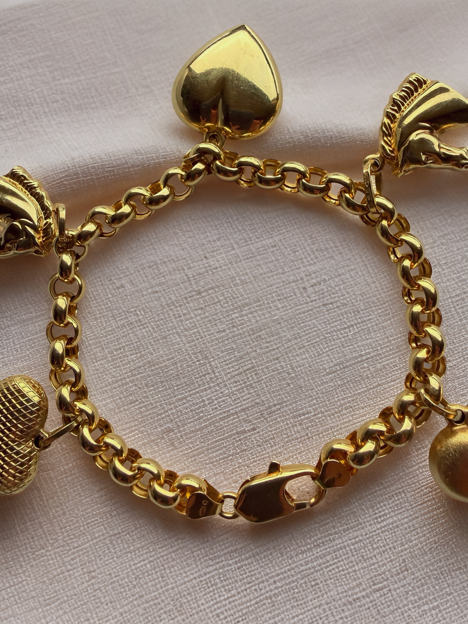 ✨ Where luxury meets timeless allure. This exquisite bracelet is handcrafted in 21K solid gold, hallmarked for purity and authenticity. Its bold chain is adorned with finely detailed heart and horse charms, creating a sophisticated piece that reflects both elegance and individuality.