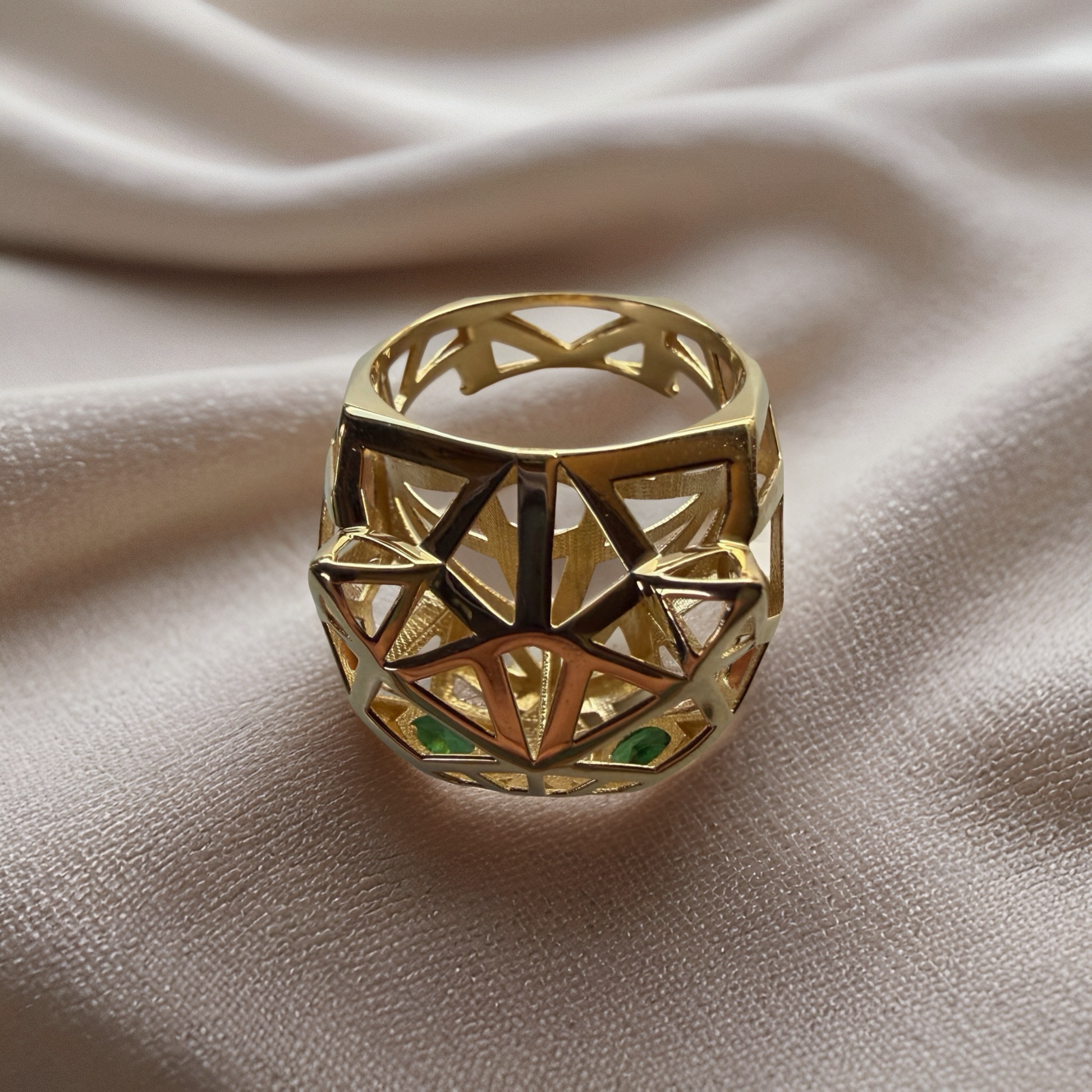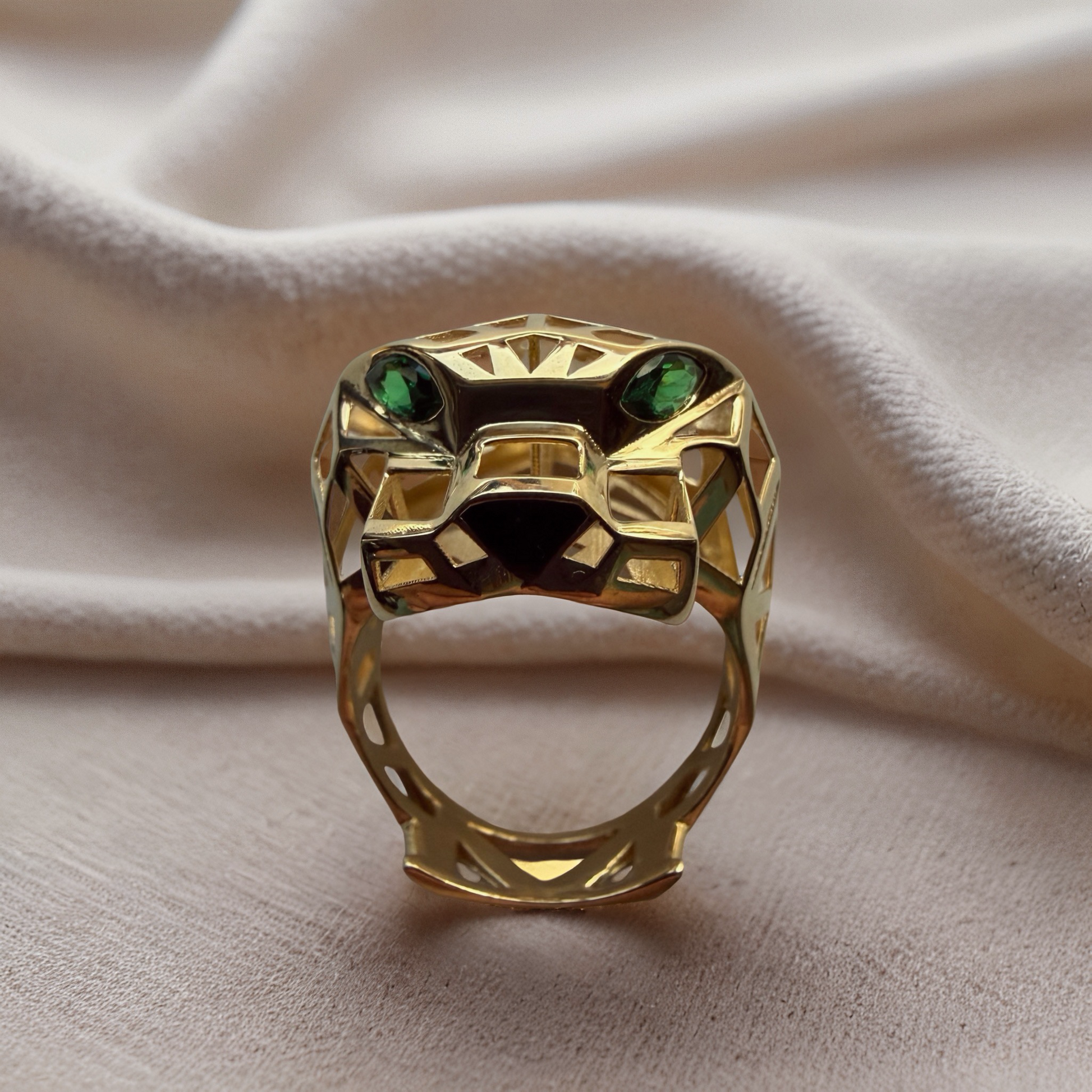 Make a bold statement with this exquisite 18K Solid Gold Panther Ring, a true masterpiece of craftsmanship and style. Designed with a geometric openwork silhouette and captivating green gemstone eyes, it embodies power, elegance, and individuality.