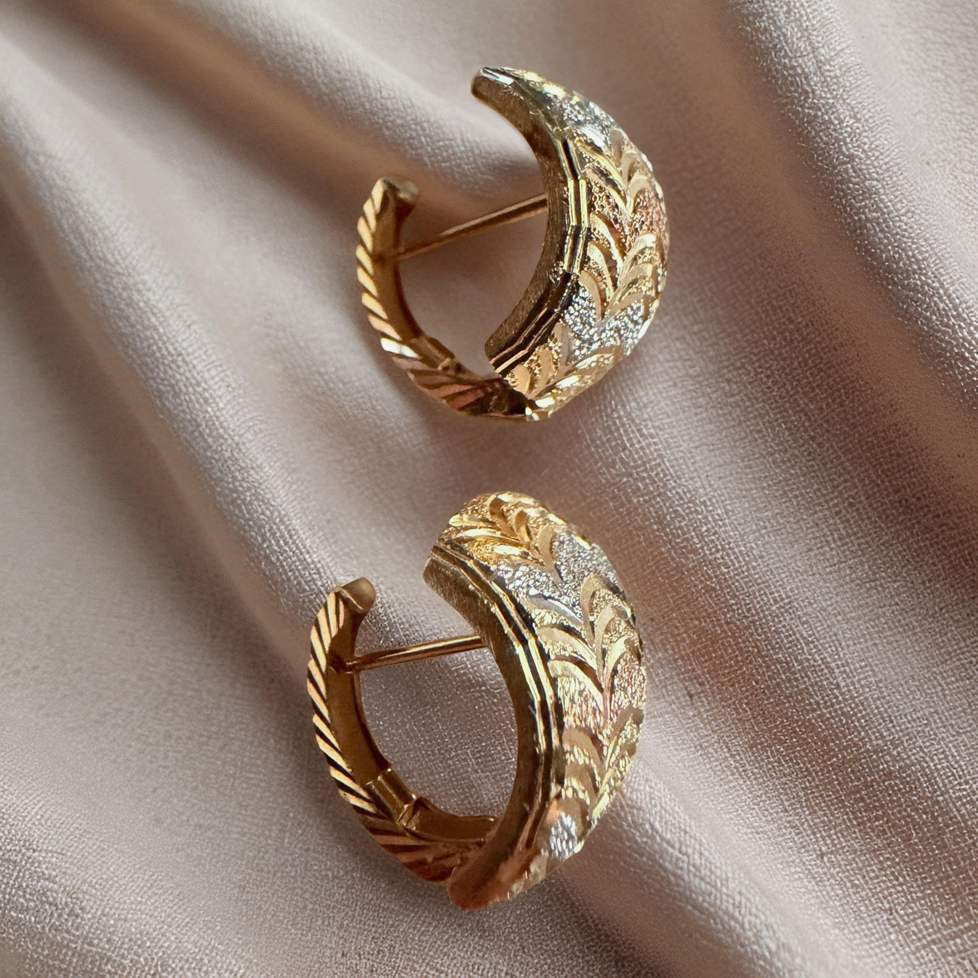 Tricolor Engraved Leaf Hoop Earrings (White, Rose & Yellow Gold)